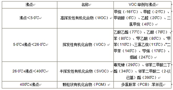 目前最常见的是WHO(世界卫生组织)规定的分类方法,它根据沸点对VOC进行了分类.